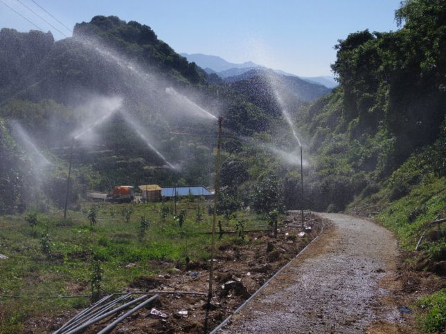 朝一番は、トラックに積んだポンプとスプリンクラーシステムをつなぐホースの修理。昨日はホースと金具を締め上げているホースバンドがゆるんで抜けてしまった。少し強いバンドを購入して再トライした。今度はホースの真ん中あたりが膨らんできた。ホースもそろそろ寿命のようだ。内径38mmのブレードホースを使っているのだが耐圧が0.5Mpaだ。今回行司が谷のスプリンクラーシステムでポンプ出口にかかる圧力が計算上で0.6Mpaなので許容値を少し超えている。これ以上の耐圧ホースは径20mmの小さいのしかない。注意して使って1年ほどで交換することにしている。ホースを新品に交換して試運転は無事終了。