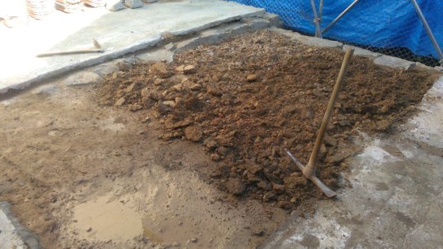 朝一番は今回のリフォームで壊した土間の跡地の手入れ。10平米ぐらいの土の空間があるので、ここに木を植えることにしている。なにを植えるか迷ったのだが、奥方がずいぶん前から鉢植えで育てているガジュマルを植えることにした。ただし、ここは土といってもいわゆる昔の土間の三和土(タタキ)だと思われる。三和土は消石灰やにがりなどを混ぜて本当に叩いて固めている。このままでは植物を育てるには不都合だ。鶴嘴でホックり返すと石灰らしい白いのが混じって出てきた。