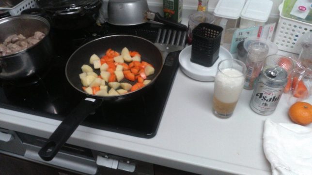 帰って昼寝のあとは、ビールを飲みながら奥方の夕食の調理の手伝い。新しいキッチンだと二人並んで調理できる。今日のメニューはカレー。玉ねぎをじっくり炒めるのがオヤジのこだわり。カナダ産の豚肉もなかなかおいしい。日本の養豚農家にとっては脅威だろう。