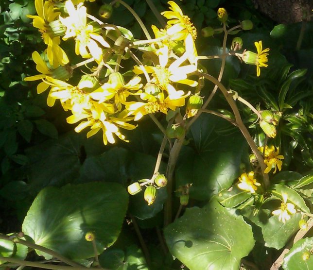今日の一枚は庭の石蕗(ツワブキ)の花。大きな葉っぱの間から茎が伸びてきて黄色い花を咲かせている。ぐんぐん茎が伸びてきて花を咲かせるところなど、雪の下に似ている。どちらも少し日陰が好きなようだ。昔の庭ではポピュラーな植物たちだが、昔の人はこういう陰影礼賛的な草花がすきだったのかな。