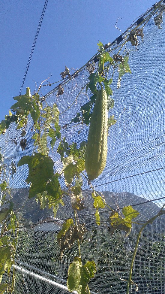 今日の一枚は糸瓜(へちま)。娘がヒョウタンカボチャとともに種をあちこちに撒いている。写真は国道沿いの新田地区の園地で撮ったもの。交通の往来が多く目立つようで、枯れた実を分けてくれという依頼もある。先日、通りかかった年配の女性が昔へちま水を化粧品として使っていたとか。なつかしそうに話しかけられた。