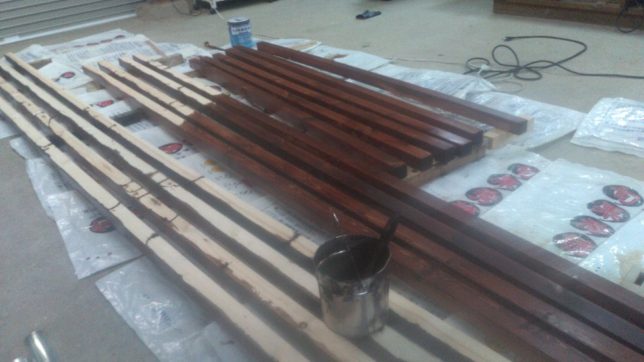 一回目と2回目の塗装の合間に屋根のポリカ波板の下に敷く横材を宇和のコメリで購入し、倉庫の作業場で切断、塗装した。塗装は防腐・防虫剤で色はライトオーク。なかなかいい感じになった。