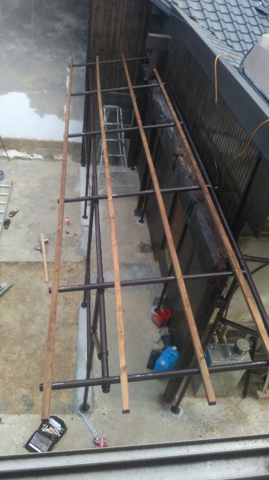朝一番は残っていた南柑20号の小玉と大玉の選果と出荷。10時ごろに片付いた。そのあとは、渡り廊下の垂木の取り付け作業。3時ごろまでかかって北側部分は終了。垂木の間隔は50cmにした。
