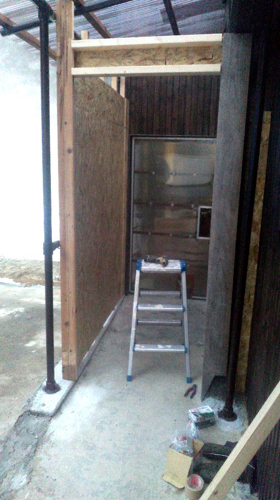 今日は朝からDIY。まずは北出入り口の壁の材料を買いに宇和のコメリへ。壁はOSB合板にすることにした。これは木片をプレスして接着剤で固めた合板で、見た目がオシャレで気に入った。夕方までかかって壁の部分はほぼ完成。次は、残り部分と天井部分を作ろう。