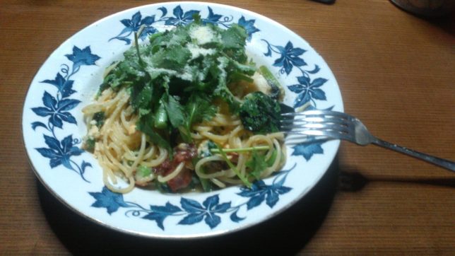 ベーコンと畑から採ってきたのらぼう菜を炒めて、茹で上がったパスタを投入、溶き卵と溶けるチーズと牛乳少々を加えてかき混ぜて、最後にパクチーを散らせば出来上がりだ。