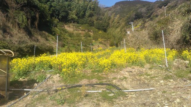 今日も剪定作業のつもりで、10時ごろまでに影平地区のデコポンの剪定を終了。次の行司が谷の紅マドンナの園地に行った。園地は見事な菜の花畑に変身していた。苗木の姿も見えない。剪定作業はやめて、菜の花を引く作業を開始した。苗木が菜の花に隠れて、せっかく撒いた肥料を吸い取られるだけでなく、一番大事な日光もさえぎられている。夕方までやってあと四分の一ぐらい残った。去年も同じことをブログに書いたような気がしたので調べたら2月23日に同じことをやっている。
