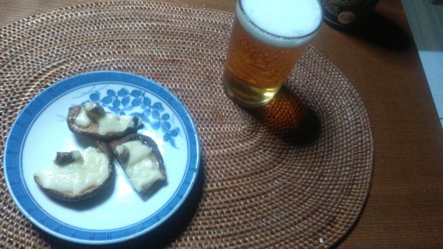 たっぷり働いたあとのビールのあては、シイタケのチーズ焼き。シイタケはミカン採りに来てくれている城川町のY崎農園産だ。少し醤油をたらしていただいた。