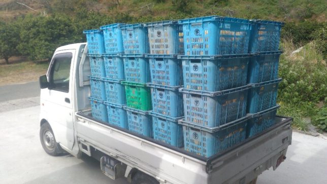 午前中はオヤジは宇和ゴールドの出荷作業。奥方は小玉の選果作業。午前中に小玉果、大玉果、格外品など加工用以外はみな出荷できた。加工用もコンテナ90杯ほどあるのだが、出荷できるのは今週金曜日になる。今日もいつもの出荷の写真。これで600kg近くある。