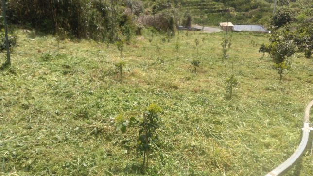曇り空で、少し雨がパラついていたが草刈り作業。だいぶ前にやりかけて、そのままにしておいた行司が谷の紅マドンナ園地だ。一日かかって終了。春草はナイロンコードでも充分刈り取れる。ここは昨年スプリンクラーを設置したところで塩ビパイプが園地の中をいっぱい通っている。土中に埋めていないので金属の刃を使うとうっかりするとパイプがやられてしまう。その点、ナイロンコードでの草刈りは安心だ。