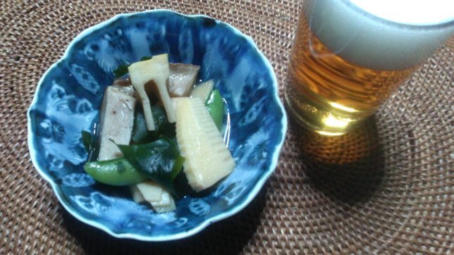 今日のビールのあては、タケノコの煮物。ワカメ、シイタケ、スナップエンドウ入りだ。味付けはめんつゆらしい。