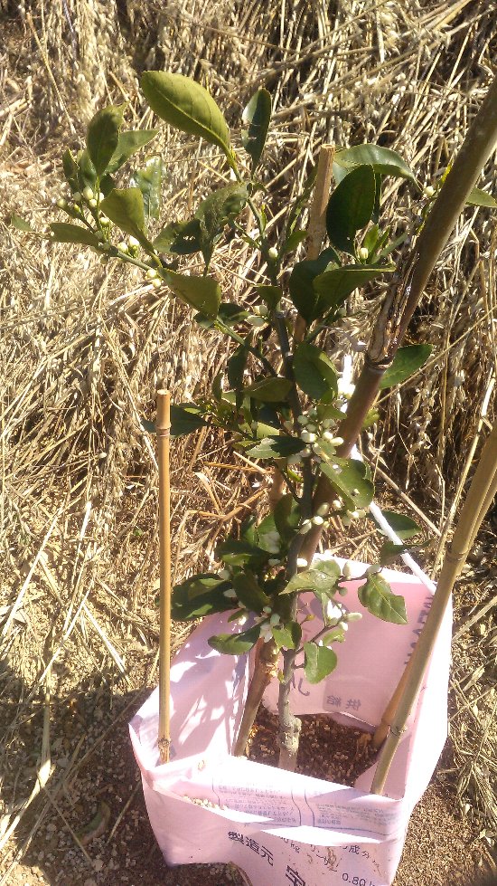 今日は和田地区、寺のウネ園地、影平園地、コークボ園地の肥料撒きが終了。寺のウネ園地には20本ほど、コークボ園地には60本ほど早生の苗木を先日植えている。久しぶりに苗木たちと対面。みんな元気にしている。つぼみを持っている苗木が多く、しばし肥料撒きを中断して花ちぎり作業を。実を生らす予定のない苗木の花は無用でちぎることになっている。こちらが苗木のつぼみだ。