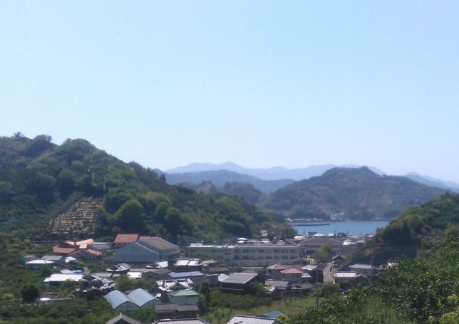 真ん中にある3階建てが玉津小学校校舎。左の大きな建物が体育館。我が母校だ。あと2,3年で吉田町で一校に統合され、廃校になるらしい。胸が痛む。体育館の左側の赤い屋根が何軒か見えるのが愛媛県のみかん研究所だ。一番遠くの真ん中にかすんでとがっているのが南予最高峰の高月山だ。法花津湾も見える。