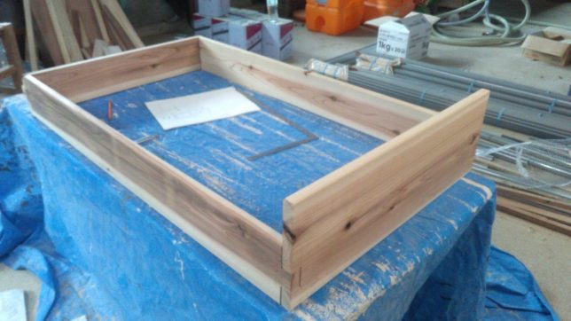 窓自体も自作しようとも思ったが、ちょっとハードルが高すぎるようなので大枚をはたいて購入。これから木材で窓枠をつくり、蔵の1階の土壁に穴を開けて、取り付けることになる。まずは窓枠の作製から。一日かかってここまで。まだまだこれからだ。