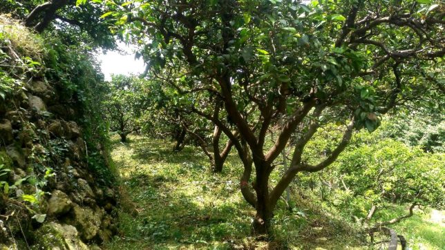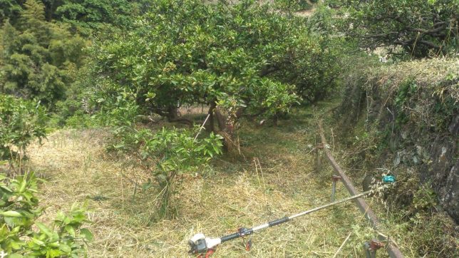 朝からいい天気。今日は草刈り。2月末にほとんどの地区に除草剤を撒いたのでまだ草は伸びてないが、その時に除草剤を撒かなかった地区が何か所かある。これから草刈りをしていく予定。今日の園地は宮ノ谷。早生の老木の園地で、去年はあまり実が生ってなかった。今年は花も多く、実がいっぱいついている。しっかり摘果して儲けなければ。園地にはノゲシやスイバが背丈ぐらいに伸びている。草刈りしたあとはこんなかんじだ。