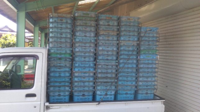 午後は雨が上がって陽がさしてきた。明日は共撰から借りている青色のコンテナを返却する日だ。先日娘と洗浄しておいたコンテナを軽トラに積みこんだ。全部で166杯。なぜか去年借りた時より16杯増えている。まあ問題ないけど。明日の朝一番で共撰に持っていく。