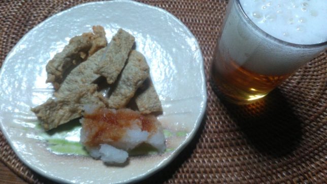 今日のビールのあては、じゃこ天。奥方が行商の魚屋さんから仕入れたやつ。大根おろしと一緒に。