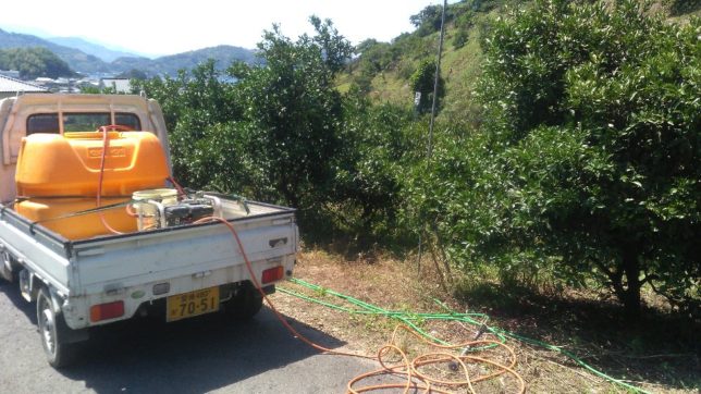 今日は朝から農薬散布作業だ。スプリンクラーでの散布は先日終わっていて、今日はスプリンクラーを施設してない園地の作業。全体の2割くらい残っている。軽トラに500リッターのタンクを積んで手掛けの散布作業開始だ。