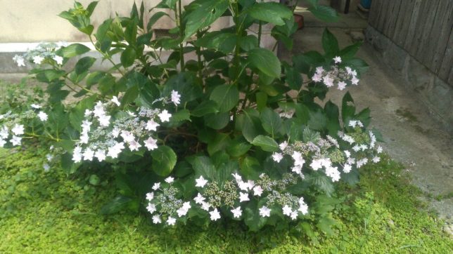 最後に我が家の庭のアジサイを紹介しよう。今朝の愛媛新聞によるとアジサイはもともと日本が発祥の地で、西洋アジサイももとはと言えば日本の原種だそうだ。地面に生えているグランドプランツはヘビイチゴだ。