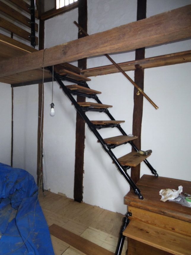 手すりは登る方向に向かって左側に単管で作ろうと思っていたのだが、左側には梁があり、足を踏み外しても落ちる心配はほとんどない。ということで壁側に市販の手すりを取り付けることにした。上から見た写真がこちらだ。