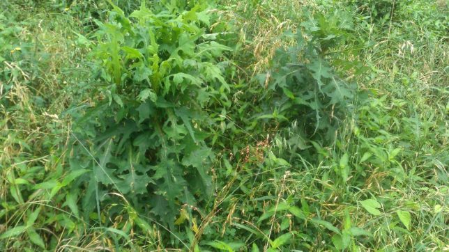 少し雨がパラついたりしているが、午前中は草刈り。行司が谷の紅マドンナ園の続きだ。ノゲシが巨大化してきていて、ナイロンコードでは手に負えないので2枚刃を使っている。ノゲシとオオアレチノギクを主にやっつけていった。これで、今回の除草は全園終了だ。ノゲシの写真を。根もとの茎が数センチにもなっている。食べられるという話もある。