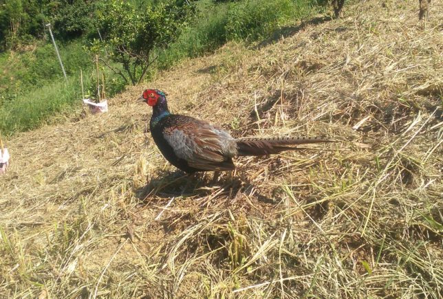 午前中は除草剤の散布で、影平地区のデコポン畑の残りの半分を終えたあとは、寺のウネの早生園地だ。ここは娘が半分くらい草刈りをしてくれている。除草剤を撒き始めたら、雄の雉に遭遇。至近距離まで近づいて写真を撮った。