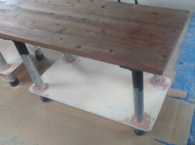 午後は4時ごろまでDIYの続き。今日は棚板に塗ったパテが乾いたのでサンダーをかけたあと、天板をビス止めした。そのあと、棚板と脚(パイプ)の間のスキマを木工パテでふさいだ。見た目はいまいち。乾いたらもう一度サンダーをかけるのだがキレイになるかな。塗装までいくのに手がかかる。
