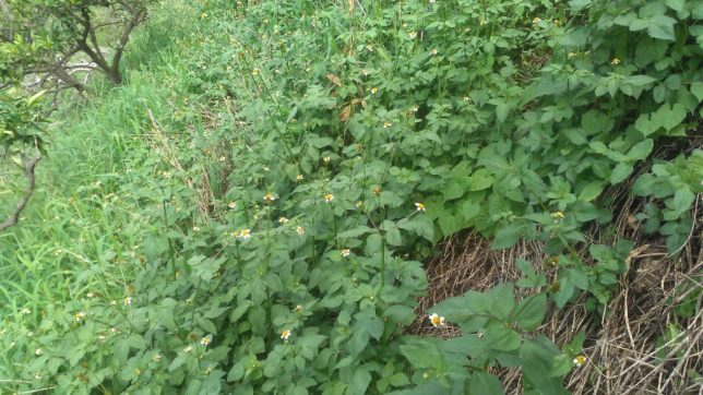 前回除草剤をここに撒いたのが6月8日と9日。2か月たつともう花が咲くまでに成長している。昨年はミカン採りシーズンにくっつき虫が多くてミカン採りさんに不評だった。早めに除草することにしよう。