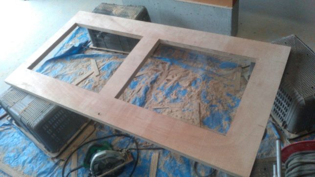 ということで、ちょっと設計変更することに。音の透過損失は重量則というのがあって、重ければ重いほど透過しにくいのだが、扉の透過損失は多少目をつぶることに。もともとそんなに防音性能が必要かというとそうでもないのだ。こういった変更は、小生の場合よくある。日和見ともいう。重量を半分にするのを目標に、扉に窓をつけることにした。窓部分には5mm厚のアクリル板を取り付けることにした。扉自体の遮音性能には目をつむって、そのかわりスキマからの漏れ音はキチンと対策するつもりだ。昨日接着した合板だが、枠の寸法より5mmづつ内側にした寸法で切断、窓部分もくりぬいた。今日はここまで。