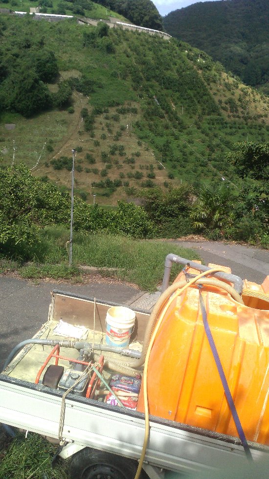 昨日に続いて農薬散布だ。和田地区の続きから開始。散布をはじめたらしょっぱなからパイプの破損が発生。修理からだ。こんな日もある。まあまあ順調で、和田地区、影平地区、宮ノ谷地区、行司が谷地区の南西部を終了。北西部にトラックで登ろうとしたら、急な坂道に竹が2本倒れかかっていて登れらない。除去したが路面が笹と雨水や泥で湿っていてトラックで登るのは危険と判断してあとまわし。午後はシオカラ地区の散布を行った。シオカラ地区での散布作業の途中で写真を撮った。なんの変哲もない写真だが、こういうのもいいかも。
