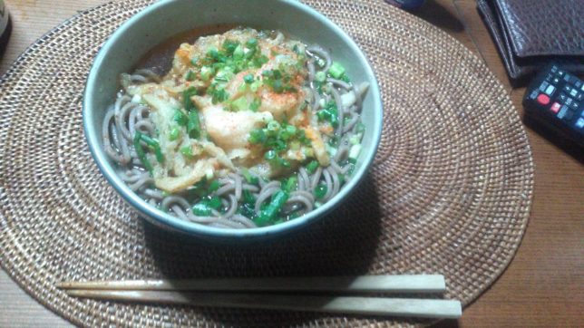 今日のお昼はかき揚げそば。かき揚げはフジで購入したエビ入り。そばとそばつゆもフジ。関東にいたせいか、そばが好きだ。特に駅の立ち食いそばが時々むしょうに食べたくなる。