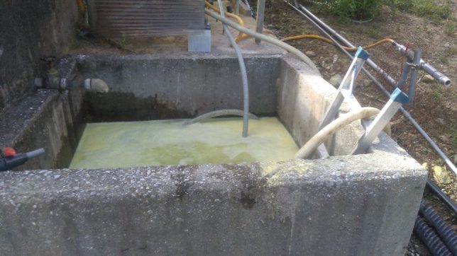 午後は、途中だった行司が谷の東斜面の農薬散布を済ませて、配管が終了した北西部と一段下の紅マドンナ園地の農薬散布だ。行司が谷の一番下にある貯水場のとなりに農薬散布用のプールがあり、そこで農薬液を作成。ポンプでスプリンクラーに送り込んで散布する。無事終了。