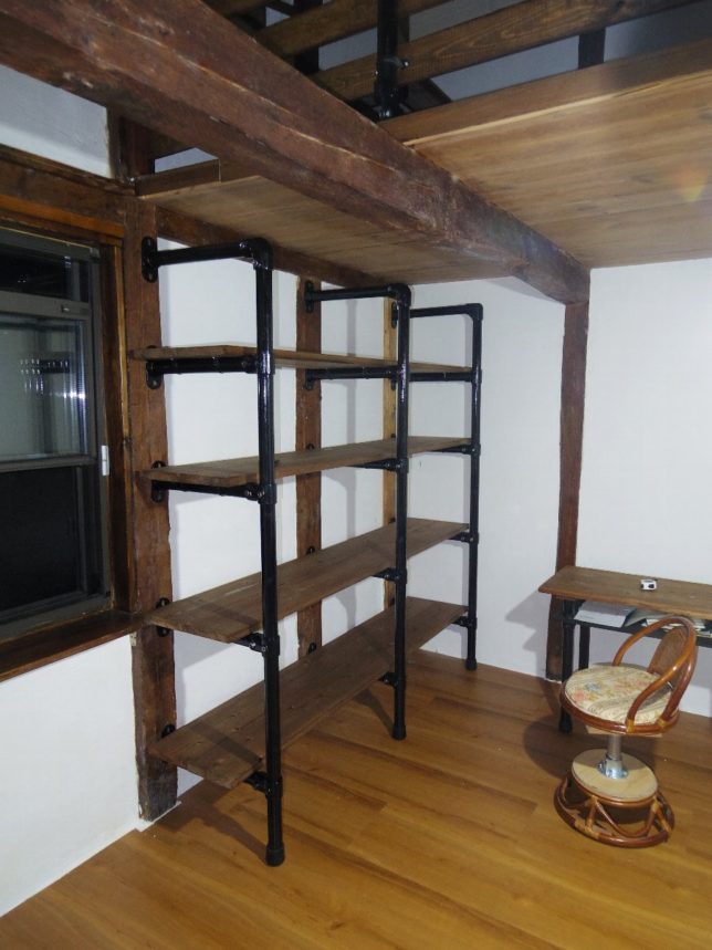 手すり、階段、机と同じく単管と木の組み合わせで統一だ。鉄パイプは安いのだが、金具をいっぱい使っているのでちょっとコスト高になったかな。