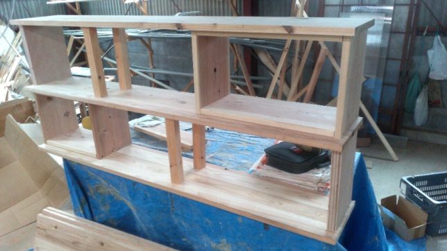 今日はDIY。本棚の材料がそろったので仮組してみた。試行錯誤して結局こんな感じになった。