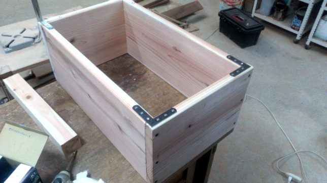 デザイン上のアクセントと剛性確保で、中央付近に端材を使った柱と、右上と左下には箱を配置してみた。左右方向の剛性を箱でもたすつもりで、裏側に金具を取り付けてある。