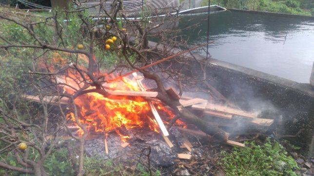 台風一過の青空、とはいかず、午前中はミカンの木は濡れているし、どんよりとした曇り空だ。午前中は仕事はやめて、このところのDIYで溜まったいらない廃材などを行司が谷で焼却した。焚火はいい。なにか本能をくすぐるところがある。