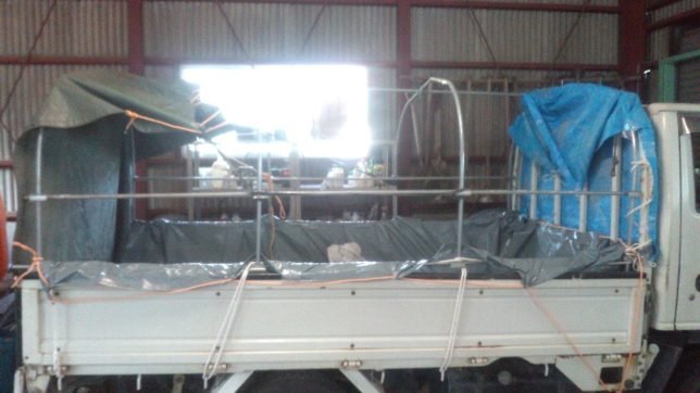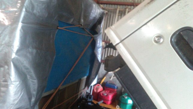 午後はエルフの幌つけ作業を開始。まず、一番前側にブルーシートをつけて雨の侵入対策。後ろ側は出入りするためのカーテンがわりのシートを設置。