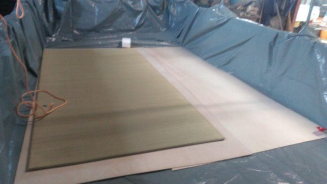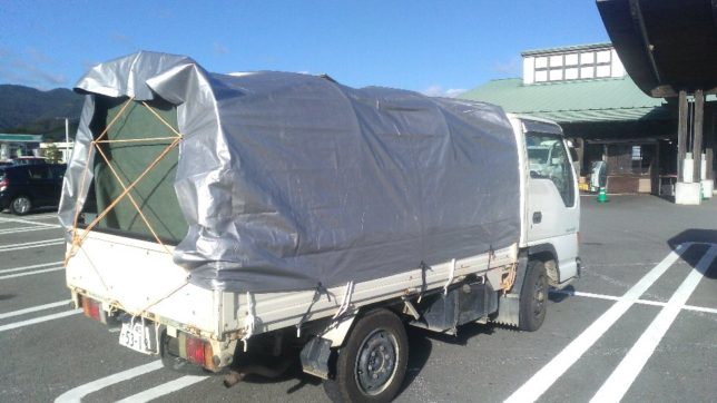 続いて、水が浸入しないように荷台にビニールシートを敷いて、その上に薄い合板とコメリで買った畳もどきを敷いた。この上に今家で使っている布団などの寝具をそのまま載せていくつもりだ。