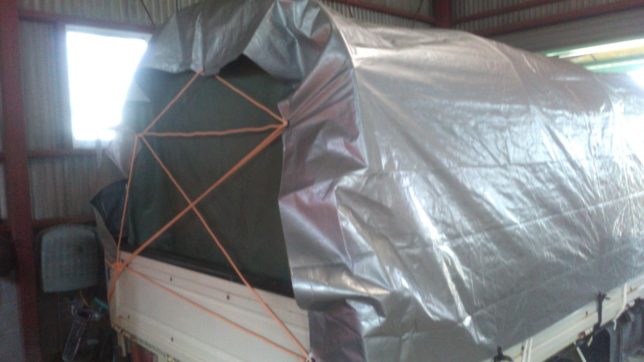 次に、ダイキで買った3300円(3.8m×3.8m)のシルバーシートを全体にかぶせて、前側をローブでしばった。久しぶりにエルフのキャブアップをやった。