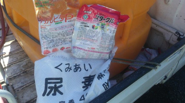 今日もいい天気。真っ青で雲一つない空だ。今日は気になっていた宮ノ谷園地(早生)のカメムシ防除をやることにした。一回やっているのだが、まだちらほらカメムシの姿が見える。ここは今年は豊作。カメムシにやられるわけにはいかない。今日の農薬がこちら。スタークルがカメムシ対策の殺虫剤。あとは液肥だ。エルフに幌をつけているので、スプリンクラー散布が行えない。今日は手がけだ。