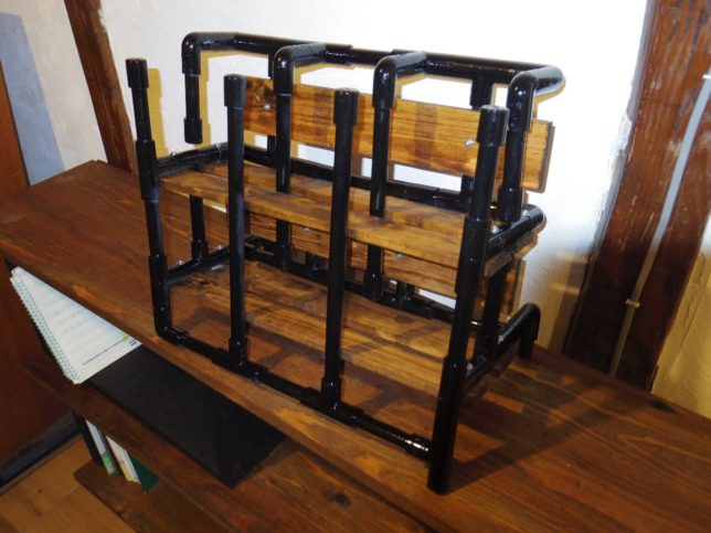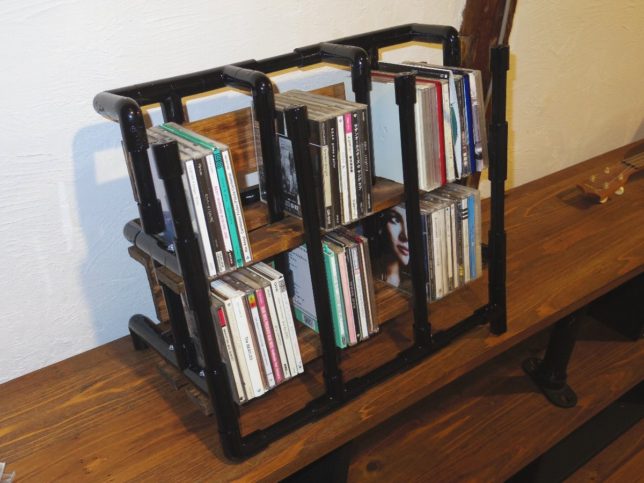 朝から一日雨だった。結構降った。今日は昨日の続きで、CDラックの工作だ。基本の構造は昨日と同じにして、少し寸法を見直してコンパクトにした。塩ビパイプ部分は接着剤を使って組み立てた。板の部分を作成して、塗装し、板を骨組みにボルトで取り付けて夕方には完成した。こちらが完成したCDラックNo.2だ。