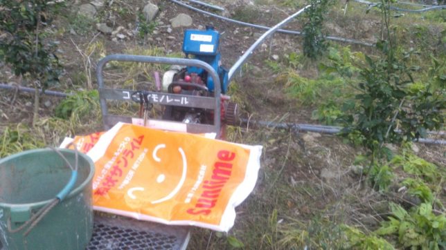 午後は、だいぶ前に購入して散布していた牡蠣殻石灰(サンライム)の散布を再開。行司が谷の紅マドンナ園と影平地区のデコポン園に撒いた。影平地区があと半分残った。
