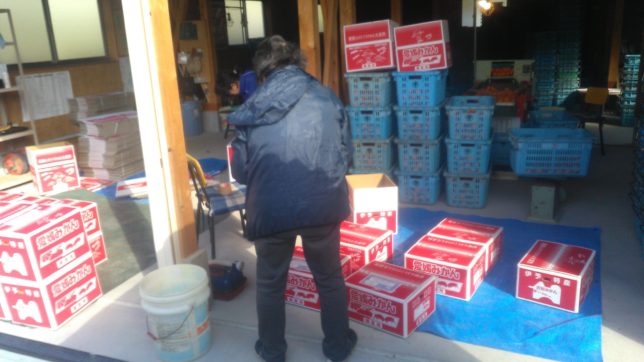 今日は朝から奥方と娘の三人でミカン送付のための箱詰め作業だ。娘が箱をホッチキスで組み立てて、フタをする役をやってくれて、小生と奥方で選果しておいたミカンを再確認のために選果機に流して、くさりや不良品のチェックをし、重量を測りながら箱詰めした。精品ではあるのだがL,M,Sサイズが混じっているので、Lサイズは取り除く作業もやって、箱にはM、Sサイズを入れている。午後三時ごろまでかかって箱詰め作業は終了。午前中に半分を発送した。残りは明日発送だ。