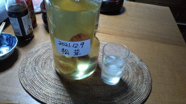 前に作っておいたマツタケ酒を味見。約2週間たったが、色もついてきている。香りもいい。味もまずまず。次は正月に飲むことにしよう。