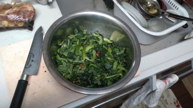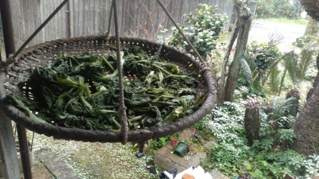 ということで、今日も農作業はお休み。このところ食い気に走っていて、料理に手を出している。朝は2日前に収穫して軒下に干しておいた高菜を刻んで、塩少々と鷹の爪を刻んだのを入れてかき混ぜた。高菜の即席漬けだ。毎年この時期のご飯のお供にかかせない。いっぱいできた。