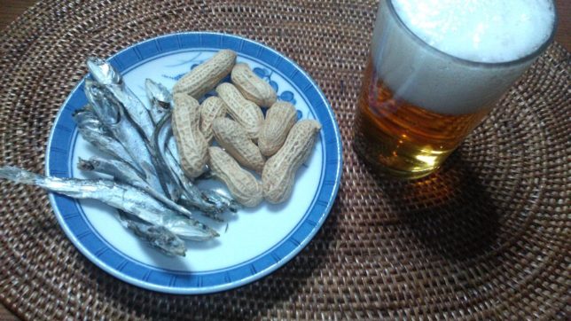 今日のビールのあてはいりこと南京豆。宇和海のいりこはおいしい。いりこはやっぱり、頭とはらわたの黒いやつはとりたい。