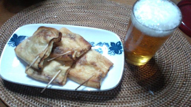 これは保存しておいていろんな料理の材料に使おう。今日のビールのあては、スヌ子氏のレシピでお揚げネギ味噌。揚げにネギ味噌を入れて焼いてある。奥方が作ってくれた。