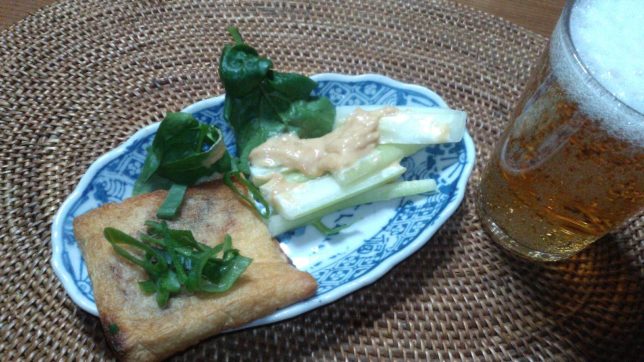 今日のビールのあてはお揚げ納豆。奥方が揚げのなかに納豆を入れて焼いてくれた。うまい。コスパ最高。クレソンとセロリの生野菜付き。ドレッシングはみそマヨ。