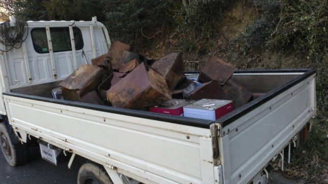 午後は液肥散布の片づけをやったあと、昨日修理して取り換えたレールや園地に放ってある壊れたモノレールの部品やスプリンクラーの支柱、そして先日やったマシン油の入っていた缶など鉄クズを集めてトラックに乗せた。先代が梅林の片隅に置いていた錆びているマシン油缶も載せて立間のリサイクル業者に持っていった。