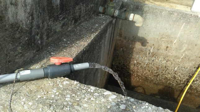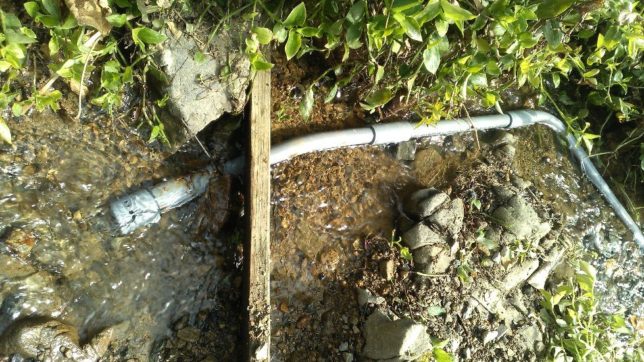 特に給水口付近で勾配つけながらの配管は難しいことが多いので工夫がいる。これは二つ目の給水口。板で水をせき止めるようにしている。ただしすぐに小石や泥で埋まってしまう。こまめな掃除がいる。