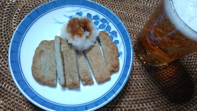 そのあとは、すっからかんになった倉庫を片づけて掃除だ。きれいにすると気持ちがいい。働いたあとの今日のビールのあてはじゃこ天。じゃこ天バインミーもおいしかったが、今日はシンプルに焼いたのに大根おろしを添えた。
